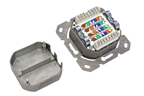 Stíněná zásuvka kat. 6A pro zakončení 10Gbps sítí. Montáž pod omítku do přístrojové montážní krabice zajišťuje čistý vzhled. Poskytuje dvojici RJ45F konektorů splňujících standardy EIA/TIA 586, s nařezávacími LSA konektory a 45° úhlem. Zaklapávací krytky a otočný zadní kryt usnadňují instalaci. Je kompatibilní i s telefonními konektory.