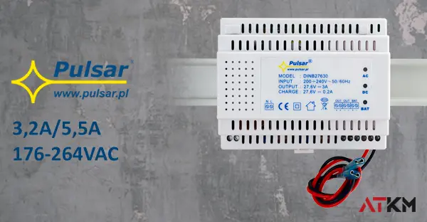 Vstupní napětí 176 – 264 VAC, max. proud 3.2A@24Vac, 5.5A@12Vdc, přídavný výstup pro zálohovací baterie.