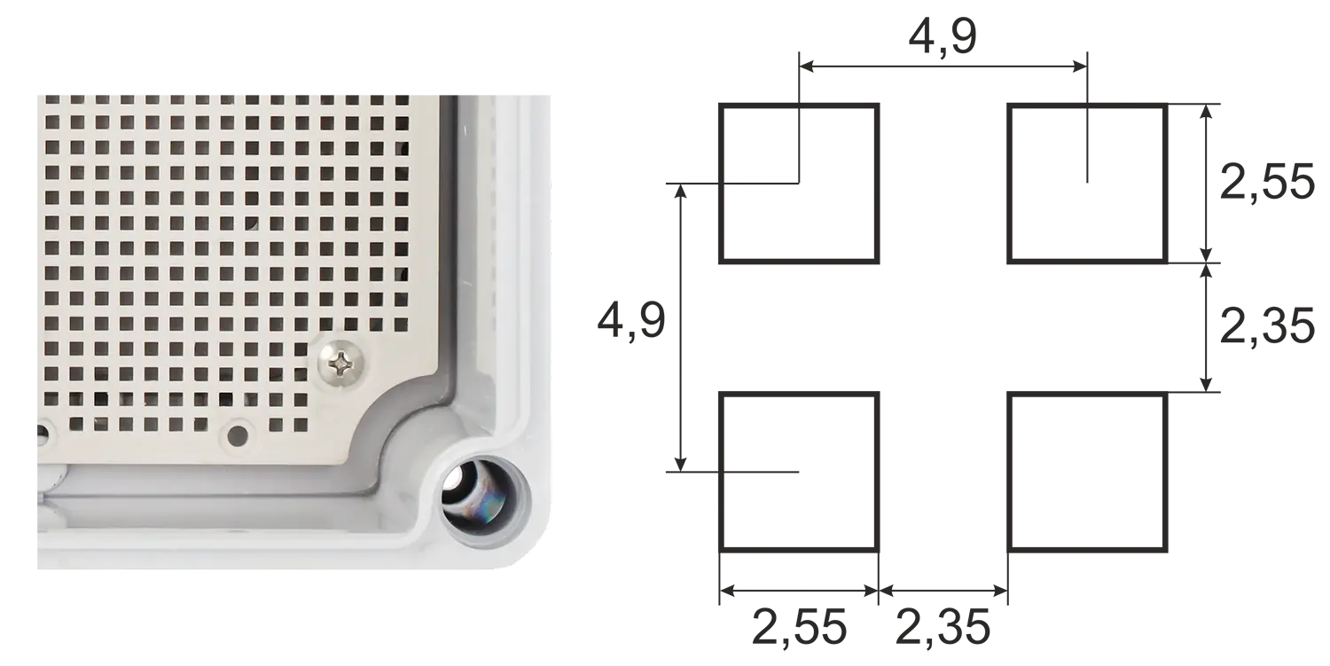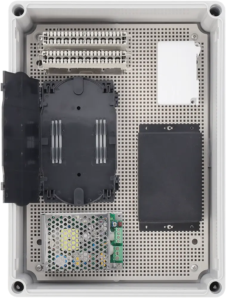 Jsou vybaveny montážní deskou se čtvercovou perforací pro snadnou instalaci zařízení a flexibilní uspořádání komponent uvnitř skříně.