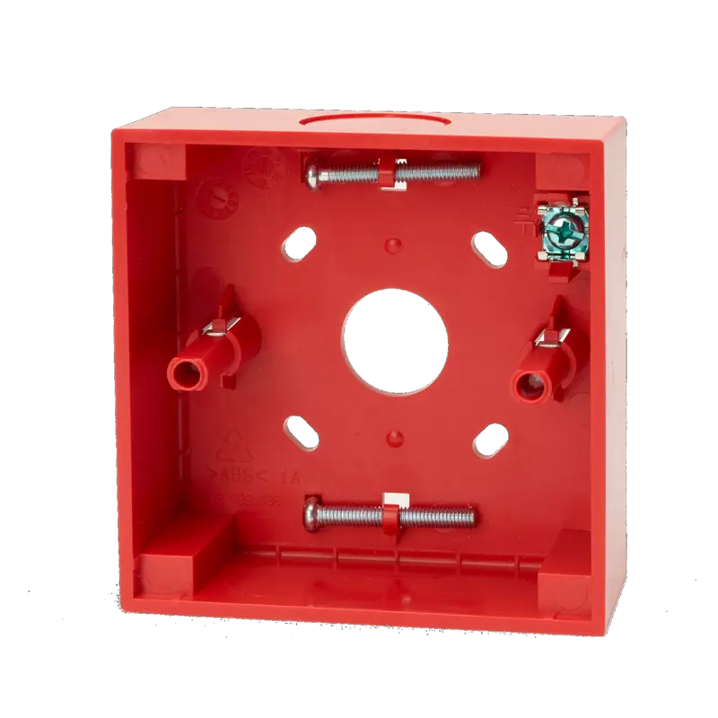 - Červené provedení s vysoce pevným plastovým krytem a montážní krabičkou určenou pro povrchovou montáž na stěnu.