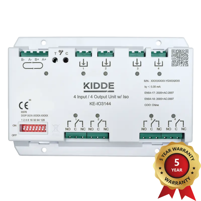 KE-IO3144 je inteligentní adresovatelný vstupně/výstupní modul řady Kidde Excellence, který kombinuje čtyři dvojitě vyvážené vstupy a čtyři výstupy relé s integrovaným izolátorem smyčky pro náročné aplikace elektrické požární signalizace. Modul je napájen přímo ze smyčky, zabírá pouze jednu adresu z 1–128 a díky pokročilému komunikačnímu protokolu s korekcí chyb poskytuje vysokou spolehlivost přenosu dat v moderních adresovatelných systémech EPS.