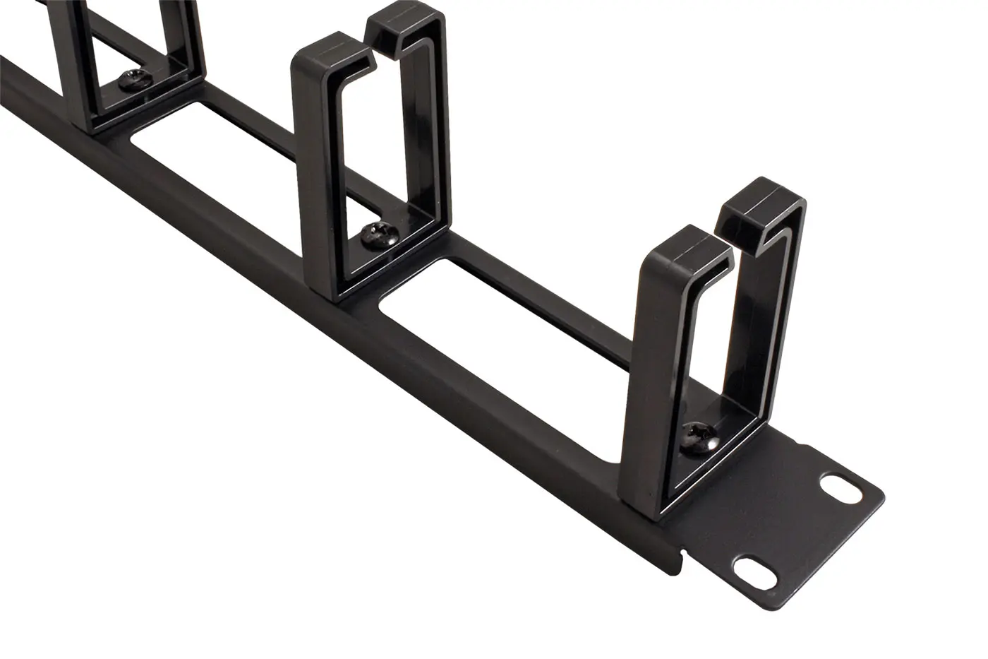 • Použití: Kovový panel s plastovými třmeny pro horizontální vedení kabelů v 19" rozvaděči. S otvory pro průchod kabelů do rozvaděče.