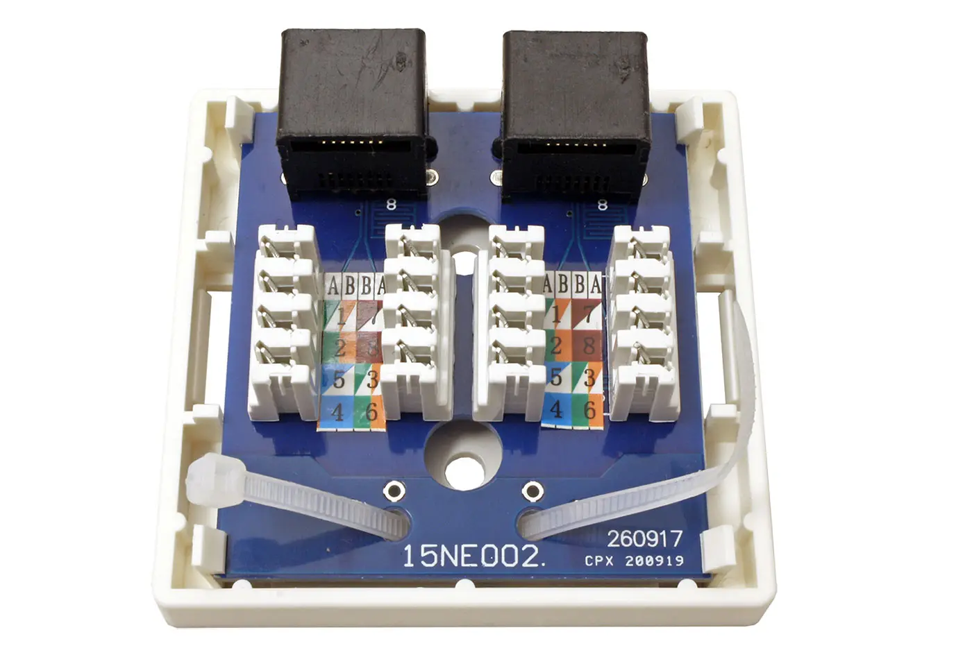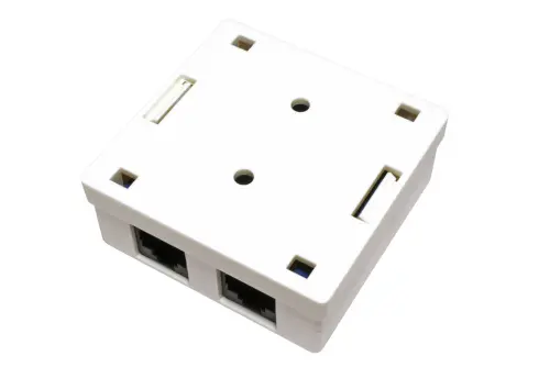 Nestíněná zásuvka pro kategorii 6, ideální pro zakončení počítačové nebo strukturované kabeláže. Montáž na omítku, dva konektory RJ45F (16x LSA). Splňuje standardy EIA/TIA 568. Konektory jsou rovnoběžně osazeny, tělo zásuvky obsahuje otvory pro přišroubování a možnost nalepení na hladkou plochu. Kabel lze uchytit stahovací páskou. Připojení kabelů vyžaduje nařezávací nástroj. V bílém plastovém provedení, zásuvku lze použít i pro telefonní konektor.